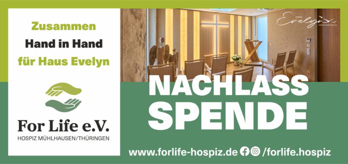In unserem Hospiz „Haus Evelyn“ ist sie gut angelegt und dient einem dauerhaft guten Zweck. Über Ihre Lebenszeit hinaus, wird Ihre NACHLASS-SPENDE viel Gutes bewirken.